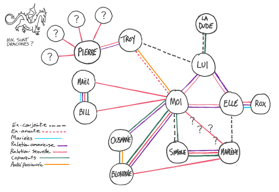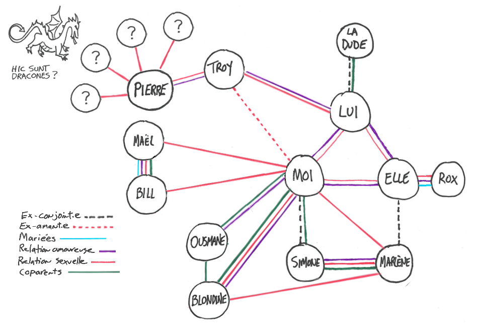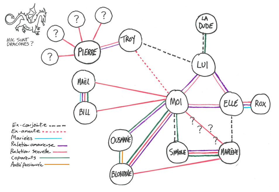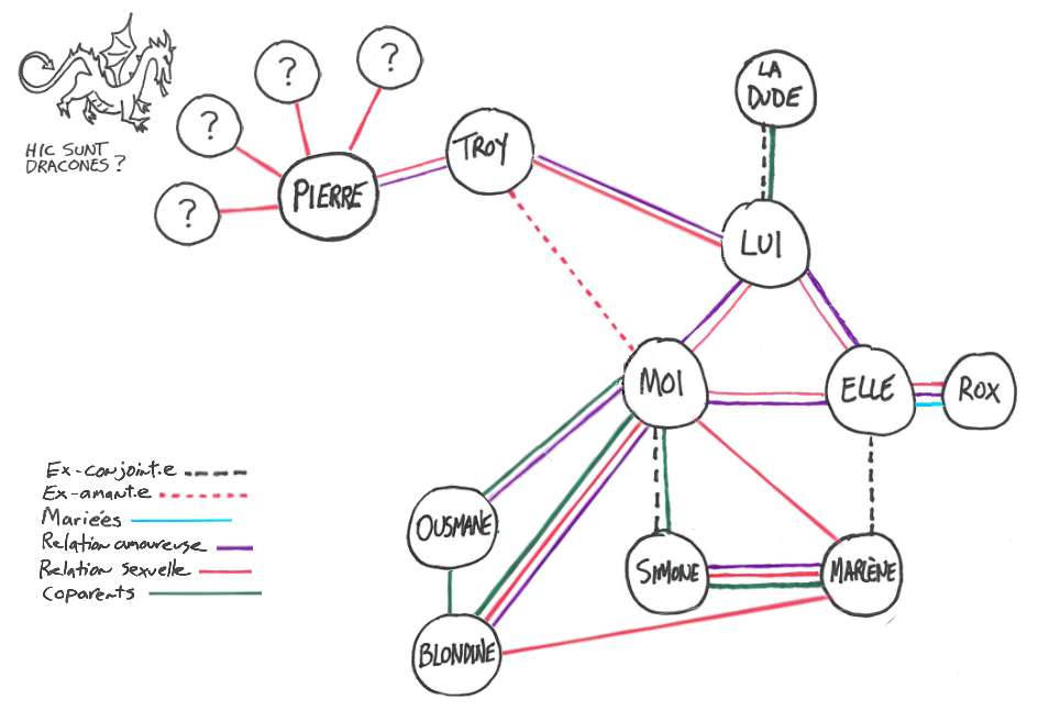 Elle — (Tristement.) Il n’y a maintenant que des traits pointillés d’ex-amoureux et d’ex partenaire sexuel qui rattachent Troy au polycule.